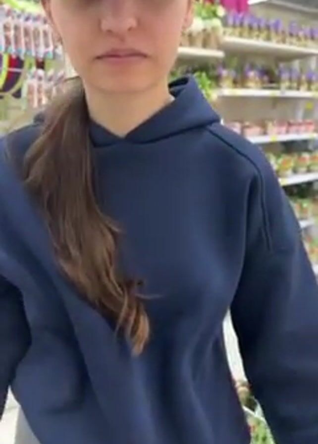 woman in a navy blue hoodie and gray sweatpants walking in a store, pushing a shopping cart. She is holding a purple cell phone. The camera then shifts to focus on a hand holding a knife. The woman notices the knife and reacts. A hand wearing a red bracelet is visible holding the knife. The scene takes place in a store aisle with shelves stocked with merchandise in the background. The store has white tiled floors.