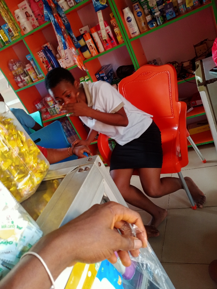 An indoor retail establishment, likely a small shop or minimart, is depicted in Unknown, Unknown. A young individual, appearing female, with short dark hair, is positioned in the center-right. She wears a white short-sleeved collared shirt and a black mini-skirt, and is barefoot. She kneels on a light-colored tiled floor, leaning forward, with her right hand covering her mouth and nose, suggesting discomfort, gagging, or distress. Her eyes are open and focused forward. An orange plastic chair stands directly behind her. To the left, a person wearing a blue shirt is partially visible behind a blue plastic chair. In the immediate foreground, a dark-skinned arm wearing a thin white bracelet is visible, holding a small clear plastic bag containing an indistinct item. Another arm, with light brown skin and wearing a gold bracelet, extends over a metal-framed counter or display case in the mid-ground. On this counter, a large clear plastic bag filled with numerous individually wrapped yellow items, possibly candies, is visible. The background consists of brightly colored orange shelves with green dividers, fully stocked with various consumer goods including lotions, cosmetics, and packaged food items such as "Nivea," "Vaseline," and "Milk Candy."