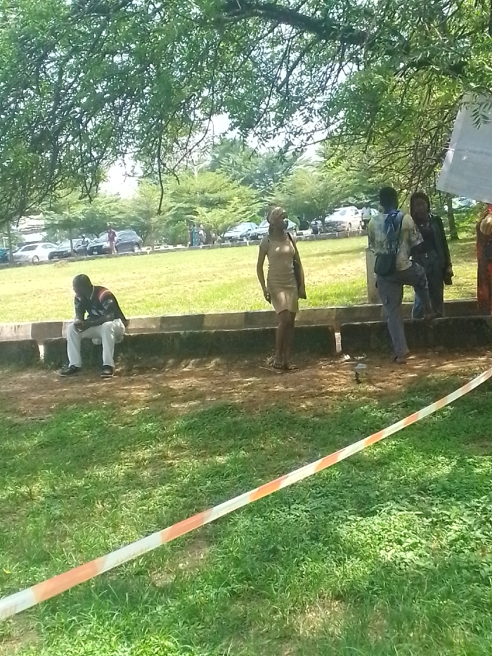 The scene depicts an outdoor public green space in the city of Unknown, Unknown, under bright daylight conditions. In the foreground, green grass covers the ground, diagonally crossed by a white and orange striped tape. A low concrete curb runs horizontally across the midground, separating the grassy area from a slightly elevated dirt path. Beyond this path, another expanse of green grass leads to a background featuring numerous parked vehicles on what appears to be a road or parking lot, bordered by dense foliage and trees. Five individuals are present. On the left, a male subject is seated on the concrete curb, with his head bowed and hands resting on his lap. He wears a dark shirt with light accents, light trousers, and dark shoes. To his right, standing on the dirt path, is a female subject wearing a light-colored, short, fitted dress, sandals, and a light-colored head covering. She holds a dark bag and is looking towards the right side of the frame. Further to the right, a group of three individuals stands on the dirt path near the curb. One individual, wearing a light-colored shirt and trousers with a visible blue backpack strap, has their right foot placed on the concrete curb and faces away from the camera. Another individual in a dark jacket is partially obscured behind them, and a third subject, identifiable by a segment of red and orange patterned clothing, is visible at the extreme right edge of the frame. No direct interactions between the individuals are clearly discernible.