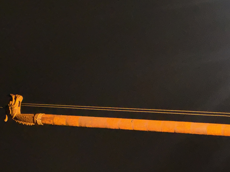 The image displays a tall, vertical pole, likely a monument or flagpole, illuminated by a strong orange-yellow light against a uniform, dark black background, indicative of nighttime. The apex of the pole is adorned with a detailed, sculpted dragon head, oriented to the right, featuring scales and an open mouth. The pole itself appears cylindrical with textured surfaces and subtle horizontal banding or segmentation along its length. Two thin, taut, vertically descending lines, possibly wires or ropes, run parallel to the right side of the main structure, also catching the orange illumination. No human figures, animals, or other environmental features are present in the frame. This structure is located at the Heungdeoksa Temple Site (흥덕사지) in Cheongju-si, Chungcheongbuk-do, South Korea.