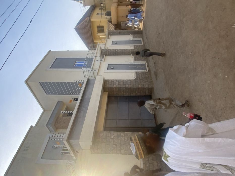 The image depicts a street scene in Dorayi, Nigeria, under clear, bright daylight with a prominent sun flare emanating from the left. In the foreground, a man, partially visible on the left, wears a white traditional garment and a light-colored cap, holding a red bottled beverage in his right hand. He faces right, observing the scene. Two children are present in the mid-ground, walking away from the camera on a unpaved dirt surface; one wears light-colored attire, the other darker clothing. The central subject is a modern two-story building featuring light beige walls with grey decorative panels and accents. It is secured by a large grey metal gate, flanked by stone-clad pillars. The building's upper level includes windows, balconies with metal railings, and security barriers resembling electric fencing. To the right of this building, a smaller structure with a reddish-brown tiled roof is visible, with a faint minaret further in the background. A group of individuals, some dressed in light blue traditional garments, are observed walking or gathered in the background on the right side of the street. The ground is consistently unpaved dirt.