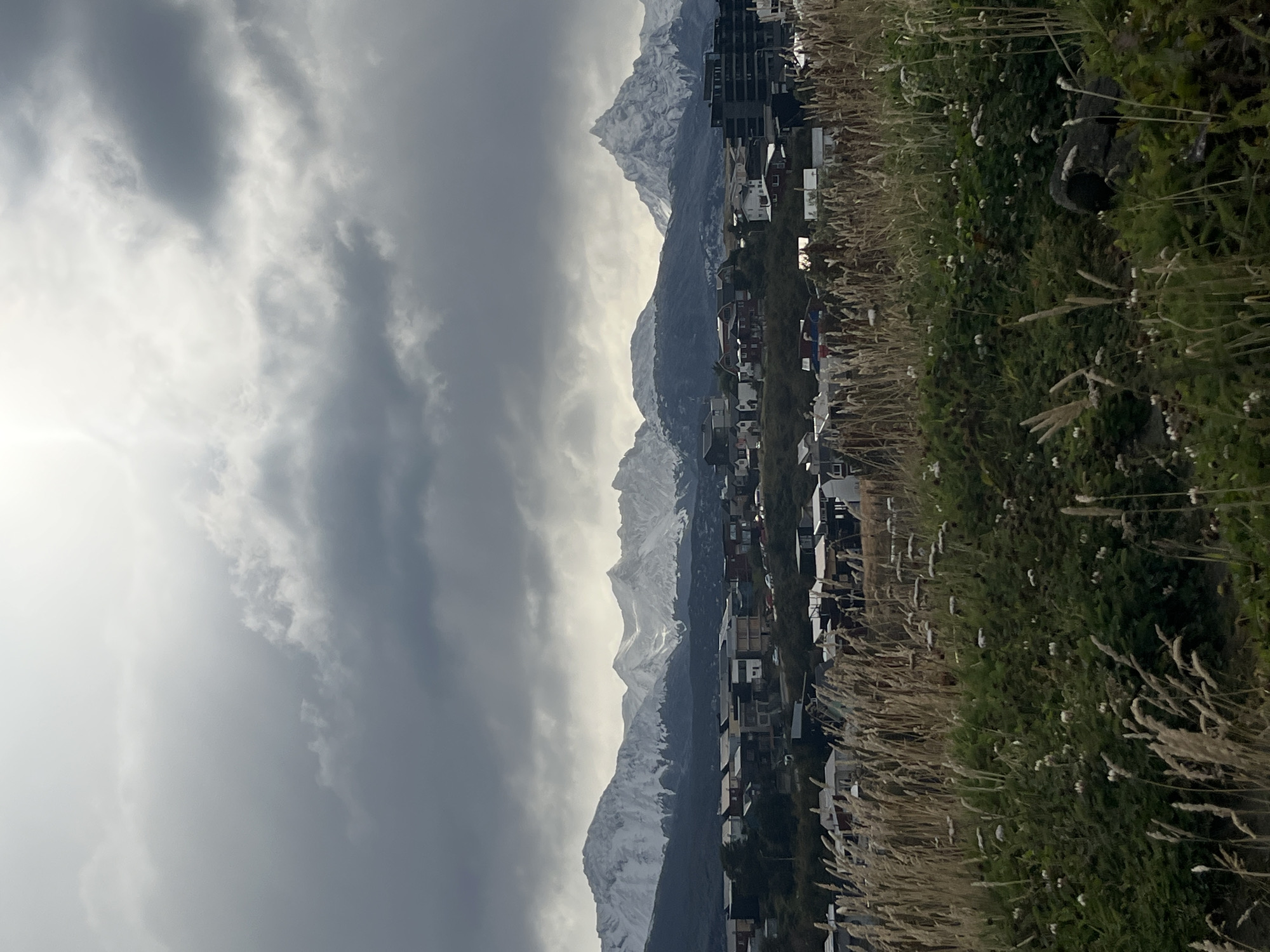 The image presents a panoramic landscape view of Ushuaia, Argentina, under an overcast sky. In the foreground, a field of wild vegetation is visible, characterized by tall, dry, light-brown grasses closest to the viewer, transitioning to lower green shrubs and smaller plants dotted with numerous small white flower clusters or seed heads further back. A dark, irregular rock is partially visible within this vegetation in the lower right. The mid-ground features the city of Ushuaia, composed of numerous buildings, predominantly multi-story residential structures and some larger, darker commercial or apartment complexes. Architectural styles vary, showing modern designs with flat roofs and traditional houses with pitched roofs, rendered in muted tones including grey, white, red, and dark brown. Indistinct vehicles are visible parked between some buildings. The background is dominated by a rugged mountain range, with peaks and upper slopes extensively covered in white snow. The lower mountain slopes appear dark, suggesting exposed rock or dense vegetation, contrasting with the snow. The sky is heavily overcast with dense, dark grey clouds. A brighter, lighter grey area in the upper right quadrant suggests a hidden light source, possibly the sun, attempting to break through the cloud cover. No human figures or discernible actions are present in the scene.