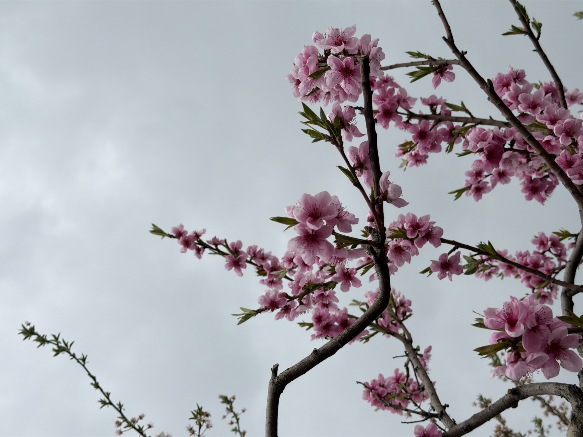 - "The image features a close-up of blooming pink flowers on branches against a cloudy, overcast sky" by FM-HDQQy2, licensed under CC BY 4.0