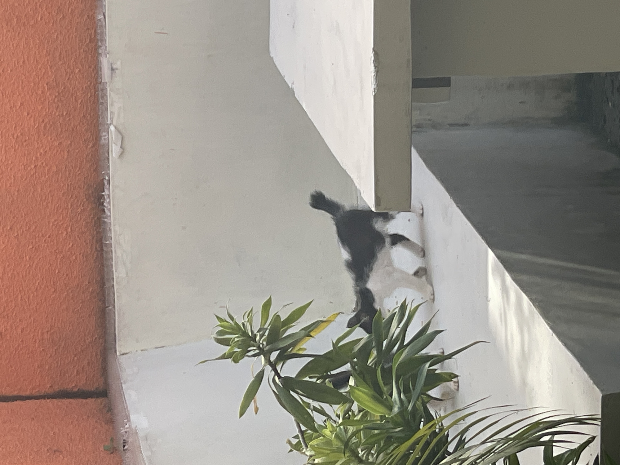 A black and white cat climbs a white, cement wall next to a plant. The location is most likely in Denpasar, Indonesia. The building is painted orange on one side of the wall.