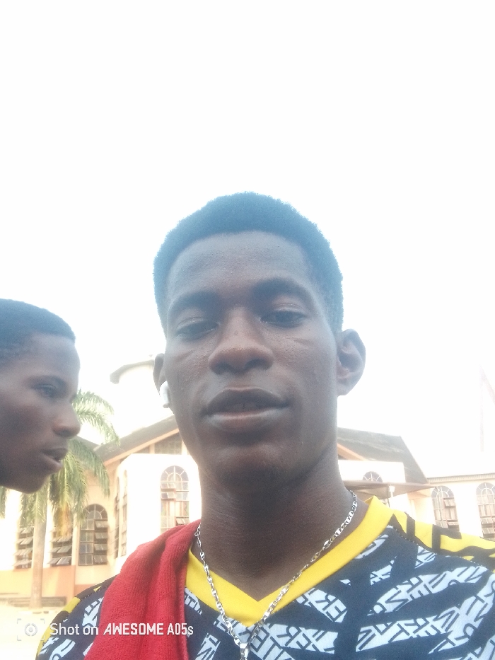 The image depicts two young Black males in an outdoor setting in the city of Onitsha, Nigeria, under bright daylight conditions