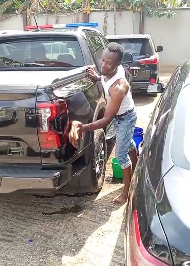 A man is washing a black pickup truck in an outdoor setting. He is wearing a white tank top and cutoff jeans, and he is barefoot. The truck has a police-style light bar on top. There are two buckets nearby, one blue and one green. A black sedan is parked close to the truck, partially obscuring the view. Another SUV is parked in the background. Lush green vegetation grows in the background behind a wall. The ground is a concrete surface with some staining. The man is focused on washing the rear quarter panel of the truck.