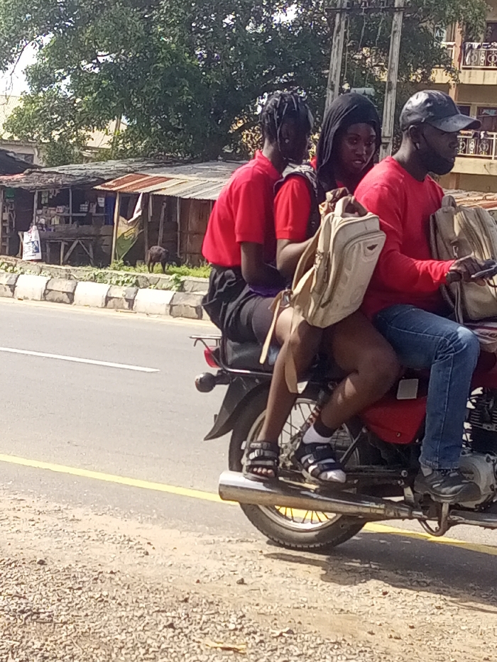 In Adankolo, Nigeria, a daytime street scene depicts three individuals riding a red and black motorcycle from right to left, positioned on the shoulder of a paved road with a solid yellow line