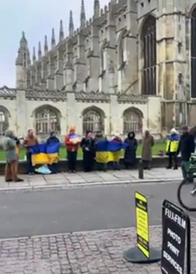A group of around a dozen people stand on a paved area in front of a large, ornate building. They are holding up Ukrainian flags. One person is speaking into a megaphone. A person on a bicycle rides past. Another person walks past carrying a green shopping bag. Two yellow Fujifilm signs sit near the edge of the frame. The sky is overcast.