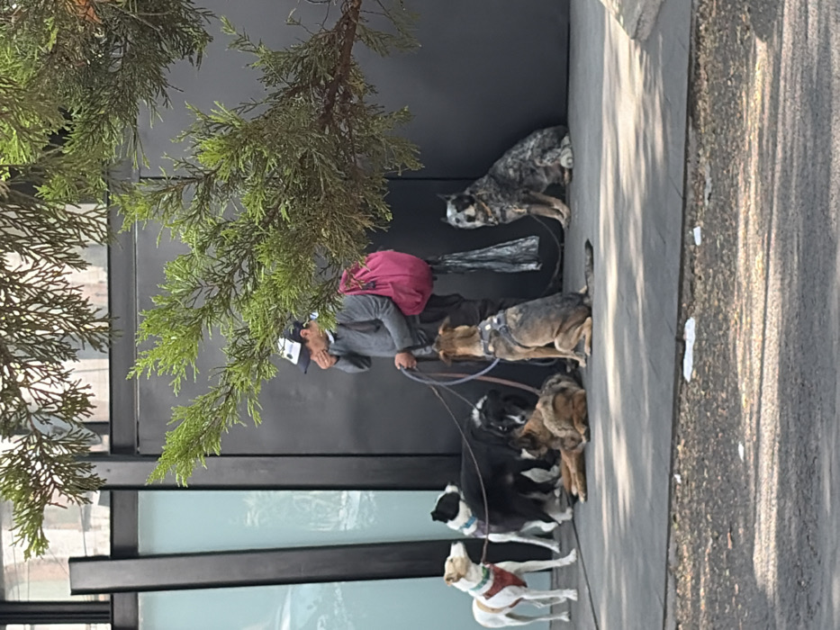 A man in a grey jacket and baseball cap walks along a sidewalk. He holds multiple dog leashes. There are at least six dogs: one speckled, one tan with a dark muzzle, one black and white, and one tan and white wearing a vest. The dogs are walking on a grey sidewalk next to a dark wall. A tree branch overhangs the scene. The man carries a pink backpack.
