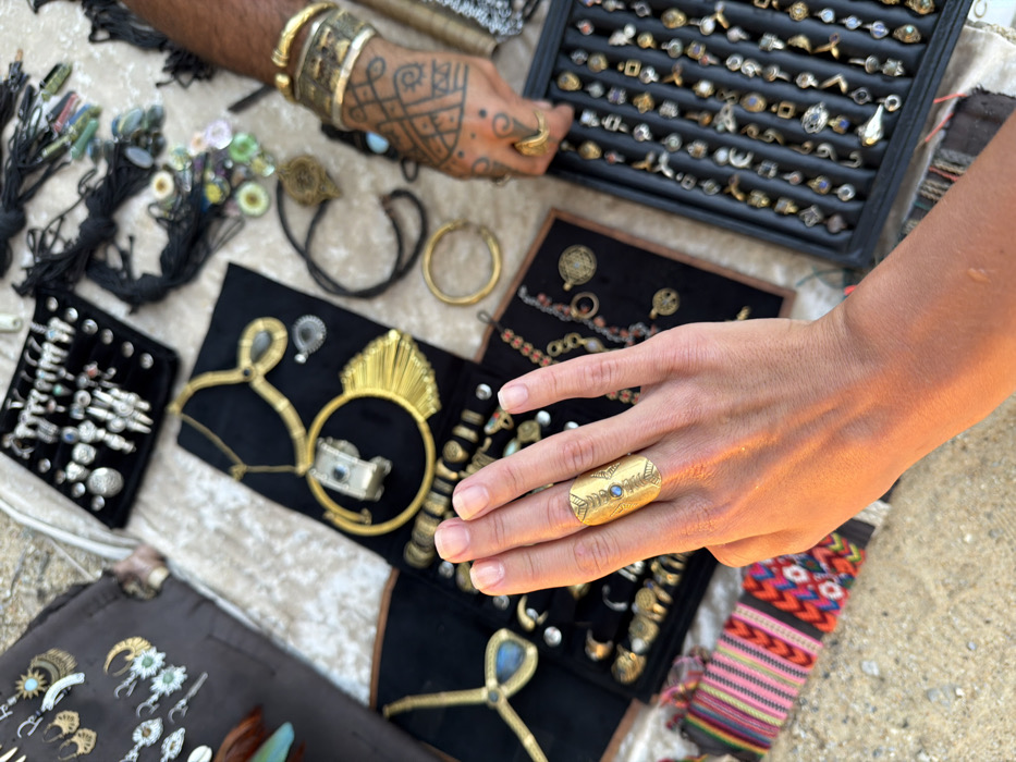 A high-angle, close-up photograph captures a jewelry display at an outdoor market in Karon, Thailand. In the immediate foreground, a tanned left hand, likely female, displays a prominent, elongated, golden shield-shaped ring adorned with etched patterns and a central light blue oval stone on its middle finger. The hand is positioned over a selection of jewelry. To the right, a tanned forearm and hand, likely male, is visible, adorned with multiple gold-toned bracelets, including one with geometric patterns, and several gold-toned rings on various fingers. The forearm displays a distinctive geometric tattoo. This hand appears to be interacting with a black tray filled with numerous rings arranged in rows. The jewelry collection is presented on diverse surfaces: a textured light-colored fabric, a section of a colorful woven textile with geometric patterns, and several black velvet-lined trays and fabric rolls. Visible items include an assortment of rings, various necklaces (some gold-toned with large pendants, others with dark cords), individual pendants, and earrings. The ground surface beneath the display appears to be light-colored sand or dirt.