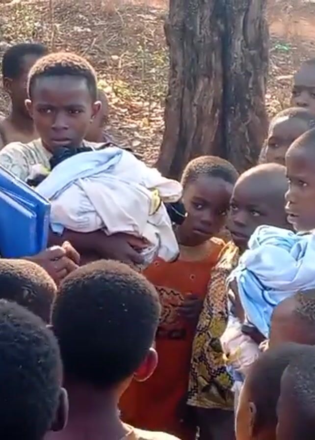 A man, likely a teacher or aid worker, stands surrounded by a group of children outdoors. He is holding a blue folder and some bundled clothing. The children are looking up at him attentively. The group is standing on a dirt ground with some trees in the background. Some children are touching each other's shoulders or backs. The children are wearing various casual clothes.