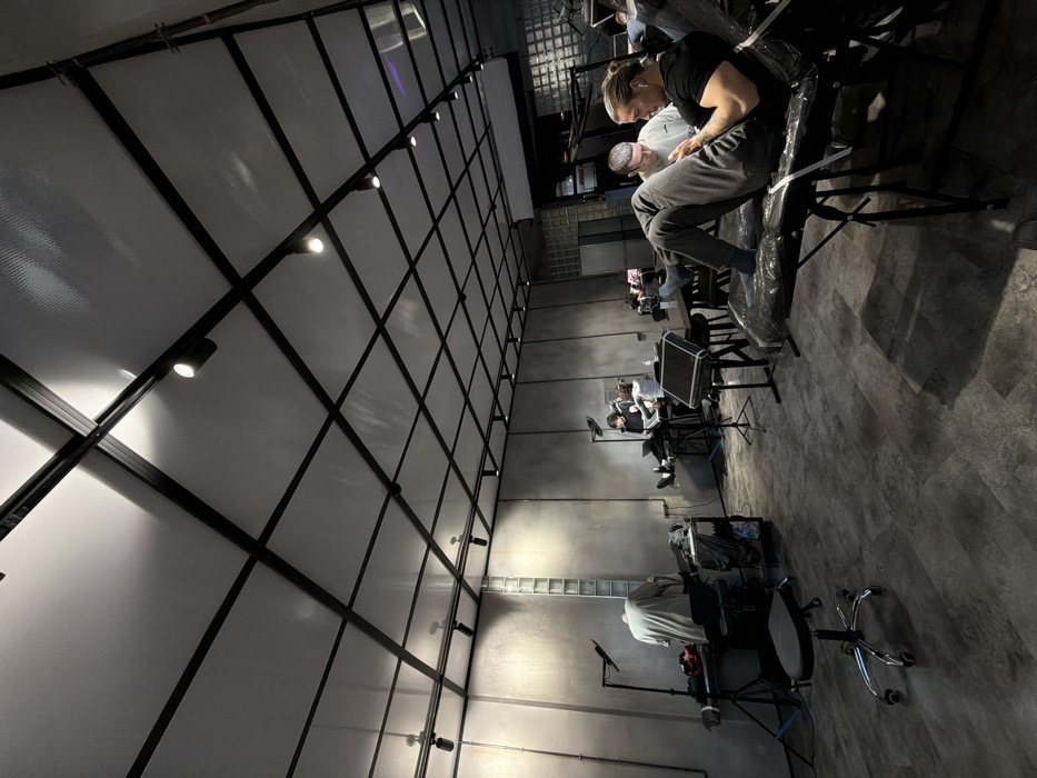 The image depicts the interior of a modern tattoo studio in Moscow, Russia. The expansive space features concrete or textured grey walls and a white grid-patterned ceiling with black exposed beams and numerous recessed black track lights providing illumination. The floor is a dark grey, possibly concrete or large tile. In the foreground, a man with long blond hair tied back, wearing a black t-shirt and grey sweatpants, reclines on his back on a black, plastic-covered tattoo bed, his feet resting on the far end. He is holding and looking at a mobile phone, and has white earbuds in his ears. Next to him, seated on a chair, another man with short dark hair and a light-colored sweatshirt also looks down at a mobile device. To the left of the foreground, a black stool with a chrome base and wheels is positioned prominently. Further back on the left, a person in a light-colored t-shirt stands facing away from the camera, bent over a workstation with equipment, including an adjustable task lamp and a trolley. A vertical stack of translucent glass blocks is visible on the far left wall. In the mid-ground center, a tattoo artist, dressed in dark clothing, is actively engaged in tattooing a client whose legs are visible on a tattoo bed. Several other black mobile carts, stands, and chairs are distributed around this area. In the background, additional workstations and individuals are present, suggesting multiple tattoo artists and clients. The overall ambiance is industrial and minimalist.