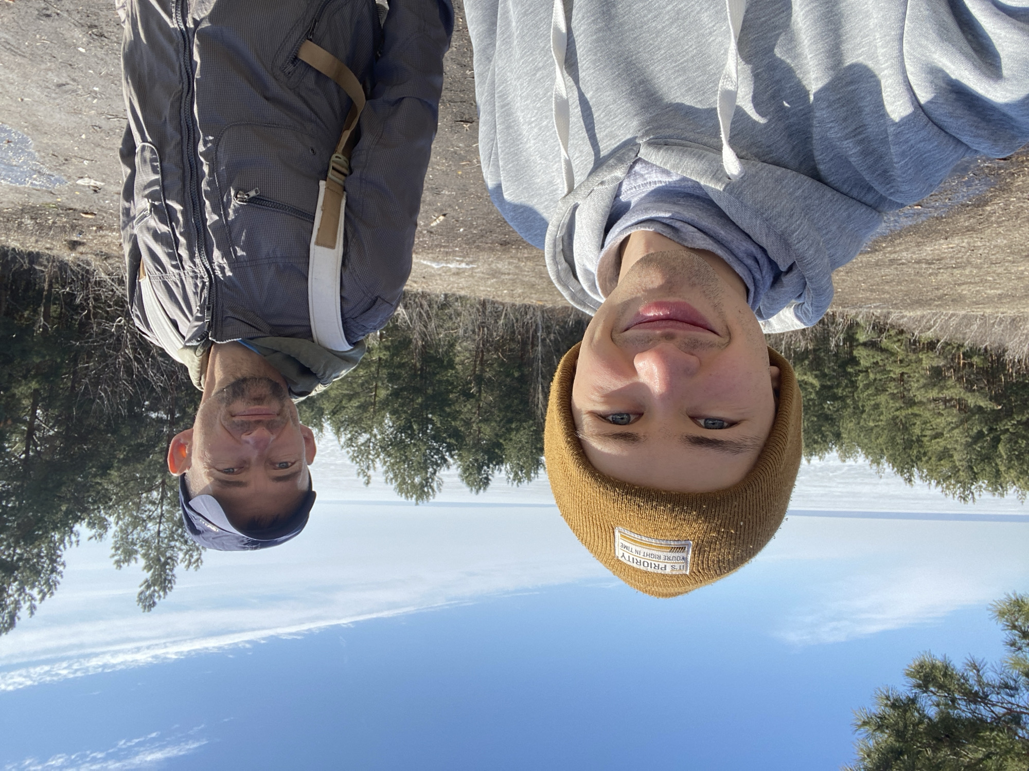 Two men are posing for a selfie outdoors. The man on the left is wearing a dark jacket and a baseball cap. The man on the right is wearing a gray hooded sweatshirt and a brown beanie. The background includes trees, a body of water (possibly a frozen river or lake), and a blue sky with clouds. The image is taken from a low angle and appears to be rotated 180 degrees. No information about the city of Ulyanovsk is provided in the image itself.