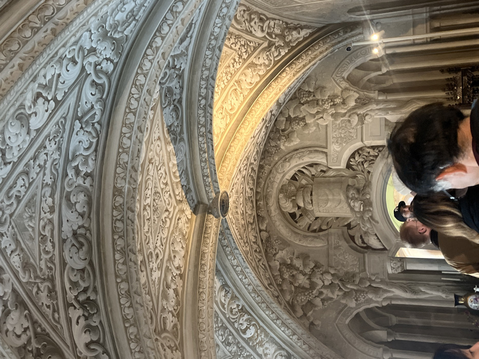 The image displays an interior perspective of a highly ornate vaulted hall within the Regaleira Palace, located in Sintra (Santa Maria e São Miguel, São Martinho e São Pedro de Penaferrim), Portugal. The ceiling is characterized by an elaborate light-colored, possibly stucco or carved stone, rib-vaulted structure, extensively adorned with intricate relief sculptures depicting floral, foliate, and geometric patterns. A small, dark circular fixture is recessed into one of the lower vault sections. Below the vaulting, a central archway is prominent, featuring deeply sculpted relief work including cascading grapevines with clusters of grapes and leaves, framing a central heraldic shield or crest flanked by stylized organic forms. Additional arched openings with slender columns are visible in the background, extending deeper into the structure. In the lower foreground, a group of approximately five to seven individuals is present, mostly viewed from the back or in partial profile. From right to left: The back of a person's head with dark, silvering hair is in the immediate foreground. To their left, an individual with reddish-brown hair and a light brown jacket stands. Centrally, a person with dark hair and a beard, wearing a black baseball cap with a white emblem, faces forward into the hall. Other individuals are partially visible around this central figure. All appear to be standing and observing the architectural environment. The scene is illuminated by a combination of ambient light and warm-toned artificial light sources, which highlight the intricate details of the ceiling and wall decorations, particularly on the right side. Several small, bright light sources are visible on the far right wall. A decorative, lidded urn with colorful floral patterns is situated on a dark surface in the lower-left background. A small, dark security camera is mounted on the wall to the right of the central archway.