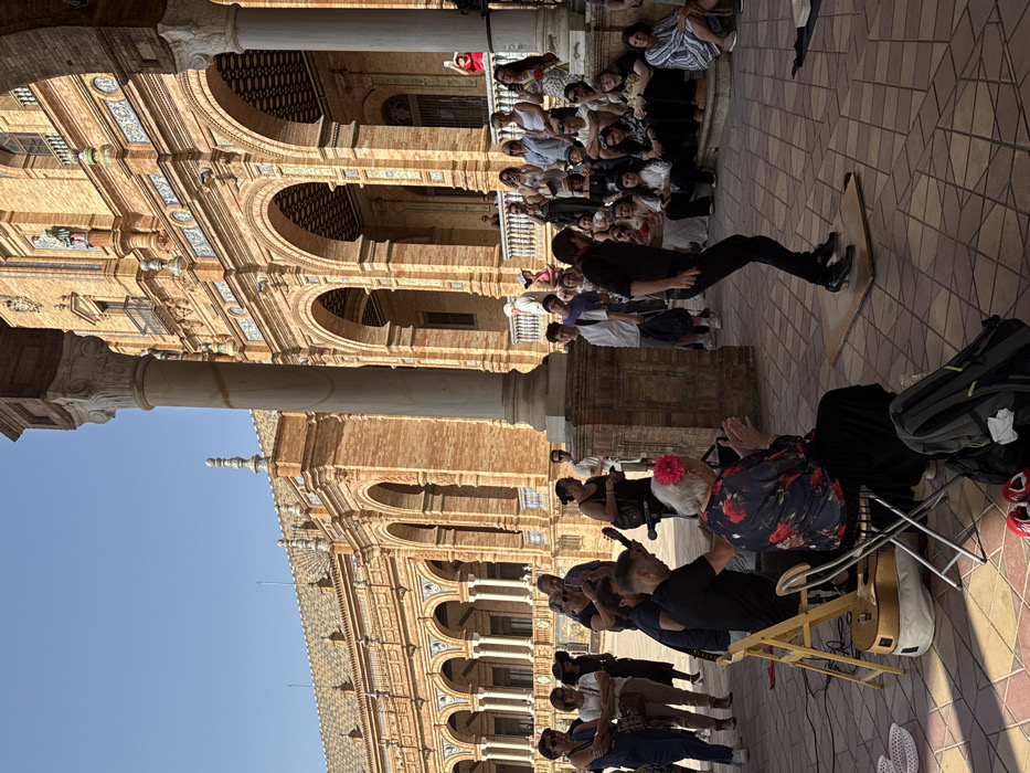 The image captures an outdoor flamenco performance at the Plaza de España in Seville, Spain