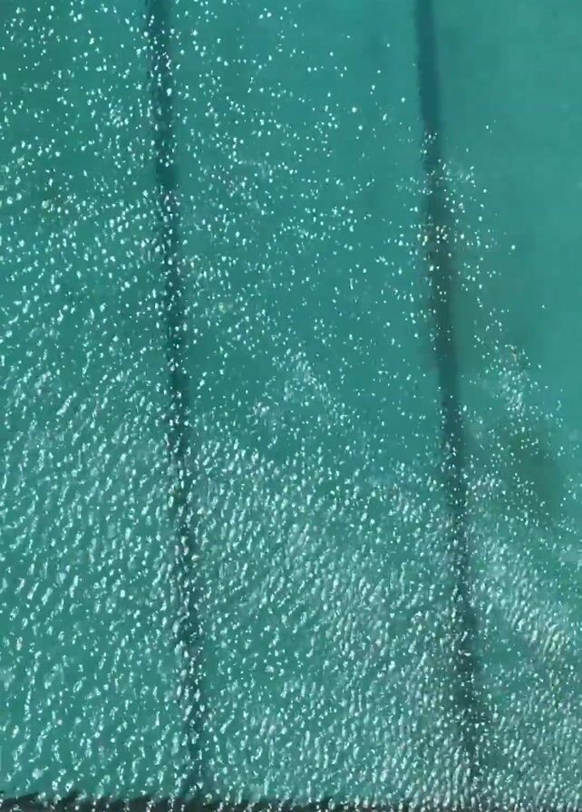 close-up, static shot of a turquoise-colored swimming pool surface. Small, bright reflections shimmer across the water, suggesting sunlight. Dark lane lines run vertically across the pool. The water surface is textured with small waves or ripples.