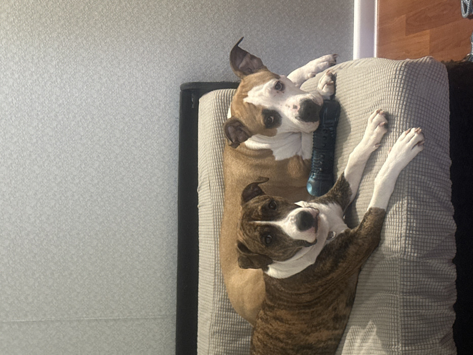 In Nekrasovskiy, Russia, an indoor scene depicts two dogs resting on a light grey, ribbed-texture couch. The dog positioned on the left has a brindle coat with white markings on its chest, snout, and front paws, and wears a white collar with a small tag, looking directly forward. The second dog, situated behind and to the right, possesses a tan and white coat, with its chin resting on a dark blue, ribbed cylindrical dog toy. Its left ear is slightly elevated. A black headboard is visible behind the couch, set against a light grey textured wall.
