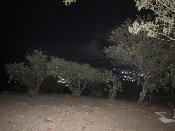 The image displays a nighttime landscape from an elevated position in Pedro González, Venezuela. The foreground consists of dark, uneven terrain, appearing as dirt or rocky ground. Across the midground, a line of deciduous trees with relatively dense, light-colored foliage stands, with their trunks and branches partially visible against the darker background. In the distant background, numerous scattered artificial lights illuminate a city or settlement, indicating urban development at a lower elevation. The sky above is dark, exhibiting faint, indistinct cloud formations. No individuals, discernible actions, or direct interactions are observed within the frame.