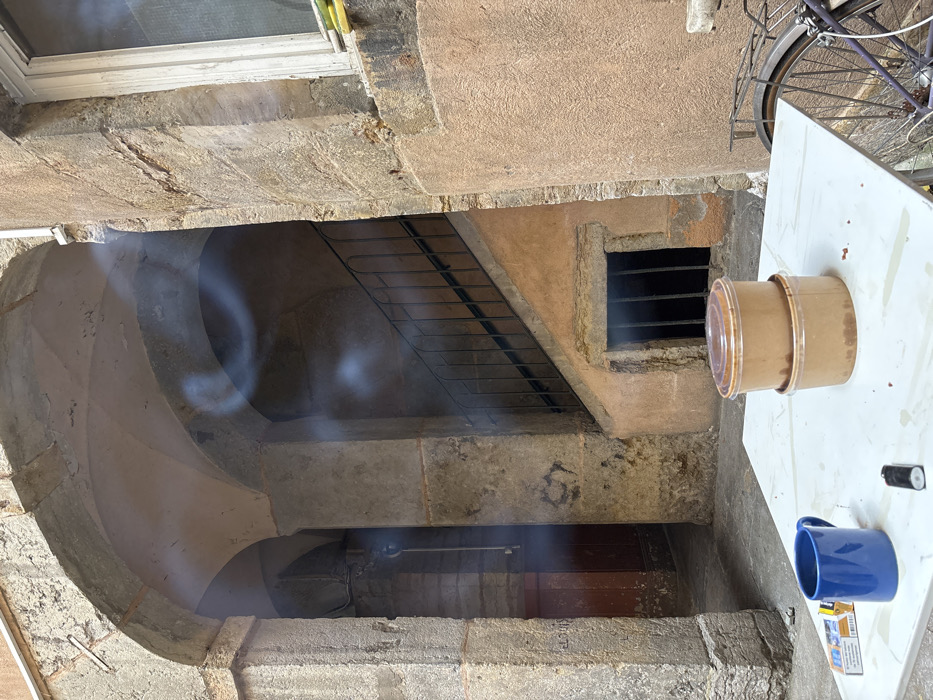 The image captures a static outdoor scene within an urban setting in Unknown, Unknown. In the immediate foreground, a white rectangular table holds two stacked brown disposable food containers with clear plastic lids, a blue ceramic mug, a white cigarette pack with red and orange branding, and a black cylindrical object resembling a small flashlight or vape pen. Dark specks are scattered on the table surface. A partial view of a bicycle's rear wheel, including spokes and a dark tire, is visible on the right edge of the table. The background consists of weathered architectural elements. To the left, multiple stone arches with vaulted ceilings form a passage, supported by robust stone pillars that exhibit visible wear and markings. A light fixture or conduit runs vertically along one pillar. To the right, a multi-story building facade features a reddish-brown stucco finish and a white-framed window on the upper right. A dark metal-railed staircase ascends from the lower right against a similarly stuccoed wall. Beneath the staircase, a small, dark window opening secured by vertical metal bars is visible at ground level. The overall environment suggests an old, well-worn urban space. Faint, circular light artifacts or lens flares are present in the upper and central portions of the image. No individuals are visible within the scene.