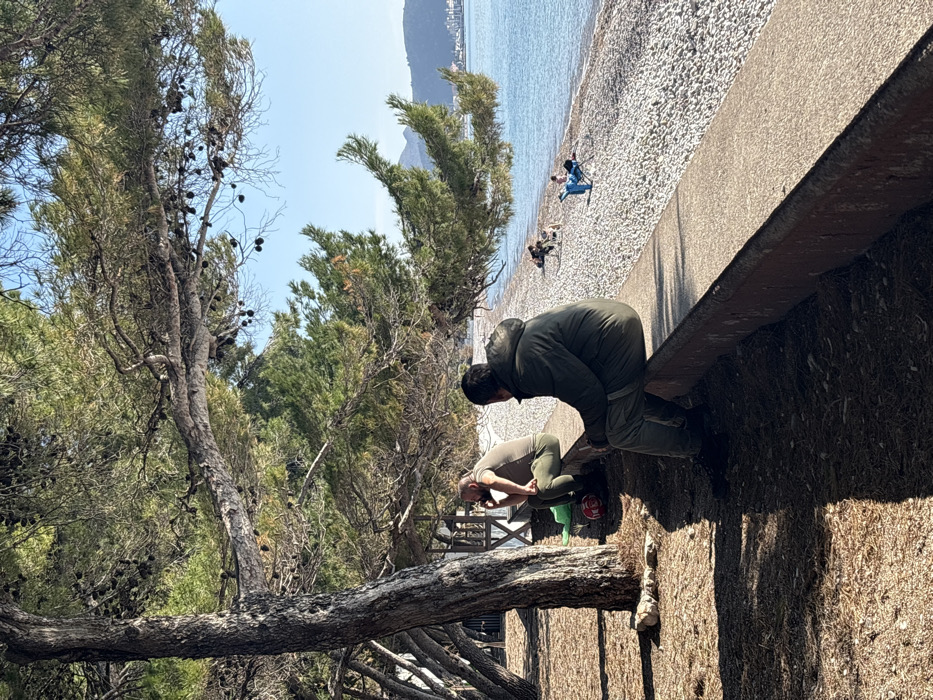 This image depicts a bright daylight scene on a pebble beach in Bar, Montenegro. In the foreground, two adult males are seated on a concrete ledge beneath substantial pine trees, which cast long shadows onto the dry, needle-covered ground. The male closer to the camera wears a dark olive-green hooded jacket and matching trousers, with his back turned towards the viewer, facing the sea. The second male, positioned behind and to the left of the first, is seen in profile. He has a beard, wears a light olive t-shirt and matching trousers, and holds a small, dark object to his mouth. Adjacent to him on the ground are a green bag and a red and white ball. Beyond the concrete ledge, a wide, light-colored pebble beach slopes gently towards the calm, blue Adriatic Sea. In the mid-distance on the beach, a person is visible seated in a blue folding chair, and another individual is closer to the water's edge. The far side of the bay reveals distant mountains and urban structures, indicative of the city of Bar.
