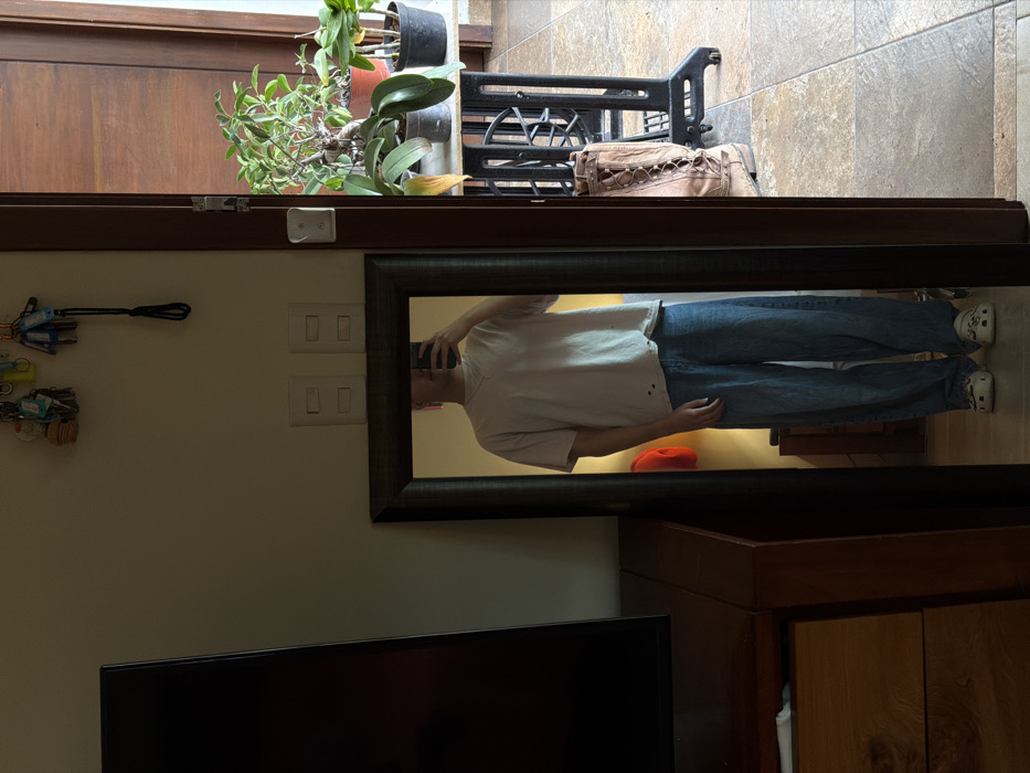 A reflection in a rectangular mirror reveals a person wearing a light-colored t-shirt, blue jeans, and white clogs, holding a phone to take the photo. Behind the mirror, on the wall, are light switches and a keychain. Above the mirror frame are a plant in a pot, a sewing machine base, and tan boots. Below the mirror are a television and a wooden cabinet.
