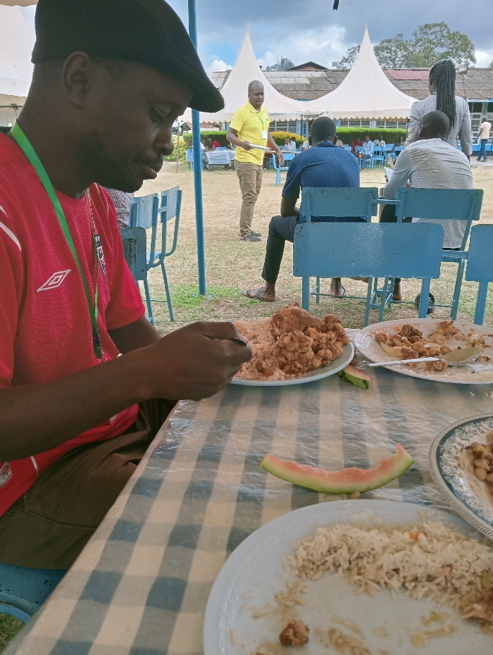 The scene depicts an outdoor meal in Machakos Central ward, Kenya, under an overcast sky