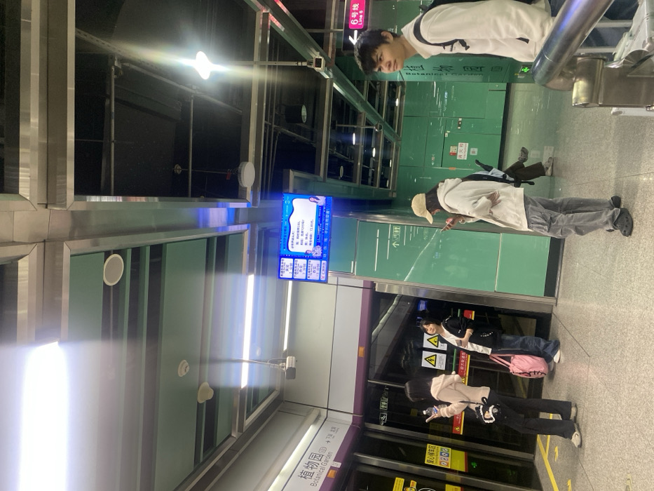 n indoor scene, possibly a subway station, with several people present. Signs indicate this is the "Botanical Garden" station. There are electrical hazard signs, direction signs and signs for line 6. A digital display board is visible. The environment appears modern and functional.