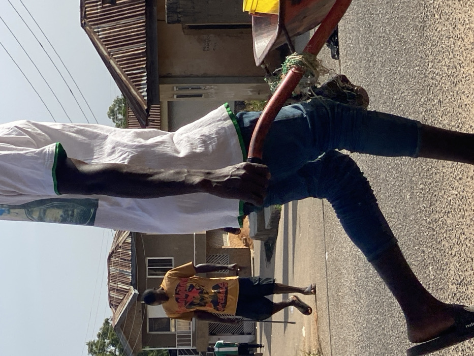 - "A dark-skinned person wearing jeans and sandals stands on a road holding a red and yellow wheelbarrow" by FM-Wbf0s1, licensed under CC BY 4.0