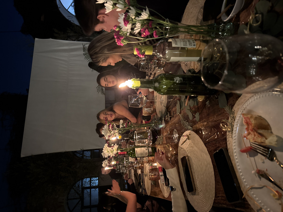 A long wooden table is set for an outdoor evening dinner. Guests are seated along the side. Wine bottles and glasses are interspersed with small vases of flowers. Candles burn in the necks of some of the wine bottles. The plates have woven placemats underneath, and smartphones are placed on the table. A tent or canopy is visible in the background, with dark trees bordering the outdoor space.