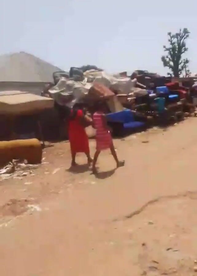 two people walking on a dirt road next to a large pile of discarded furniture and other items. One person is wearing a red outfit, and the other is wearing a pink and white striped dress. The person in red is carrying a white bucket. In the background, there are buildings, umbrellas, and a car driving by. The sky is clear and blue. There is trash and debris scattered along the side of the road.