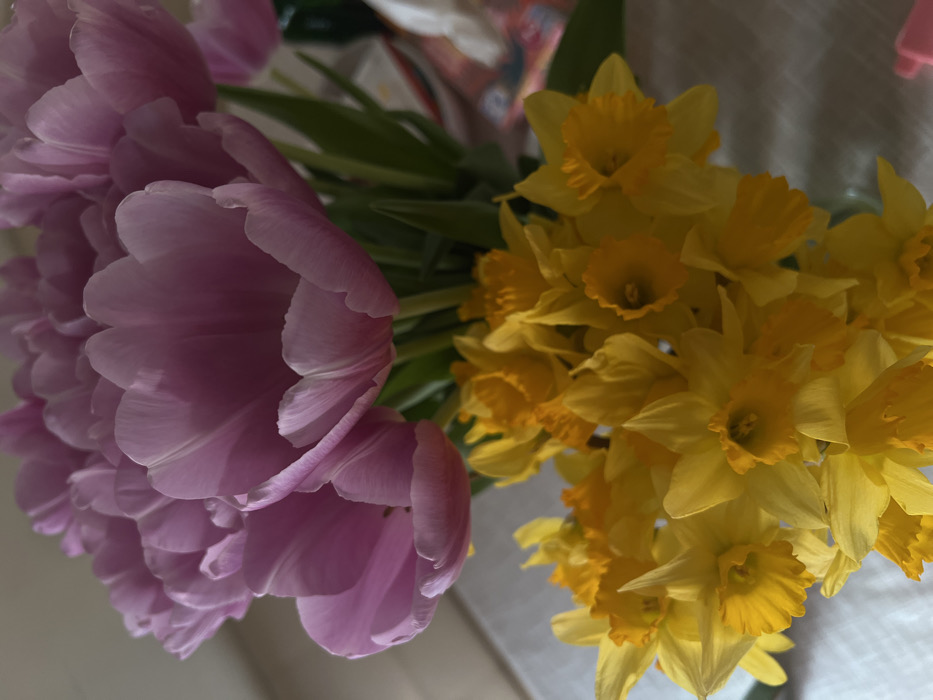 The image displays a close-up view of two distinct floral arrangements, presented indoors in the city of Leninakan, Russia. The upper portion of the frame is dominated by a cluster of approximately ten to twelve light purple tulips, each featuring soft, rounded petals and green stems. Below and in front of the tulips, a dense bouquet of numerous bright yellow daffodils is visible, characterized by their prominent orange-yellow trumpet-shaped coronas and multiple petals. The background is largely out of focus, showing a light-colored surface towards the upper left, while the right side contains blurred details including a dark green object and indistinct patterned material. The bottom right foreground reveals a light-colored, textured surface, consistent with a tablecloth or similar covering, upon which a small, out-of-focus pink object rests. No individuals, specific actions, or direct interactions are present in the scene.