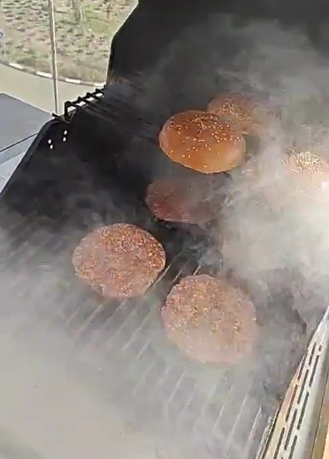 - "A person is grilling hamburgers, sausage, and buns on a gas grill outside on a patio or balcony" by FM-zE0mP2, licensed under CC BY 4.0
