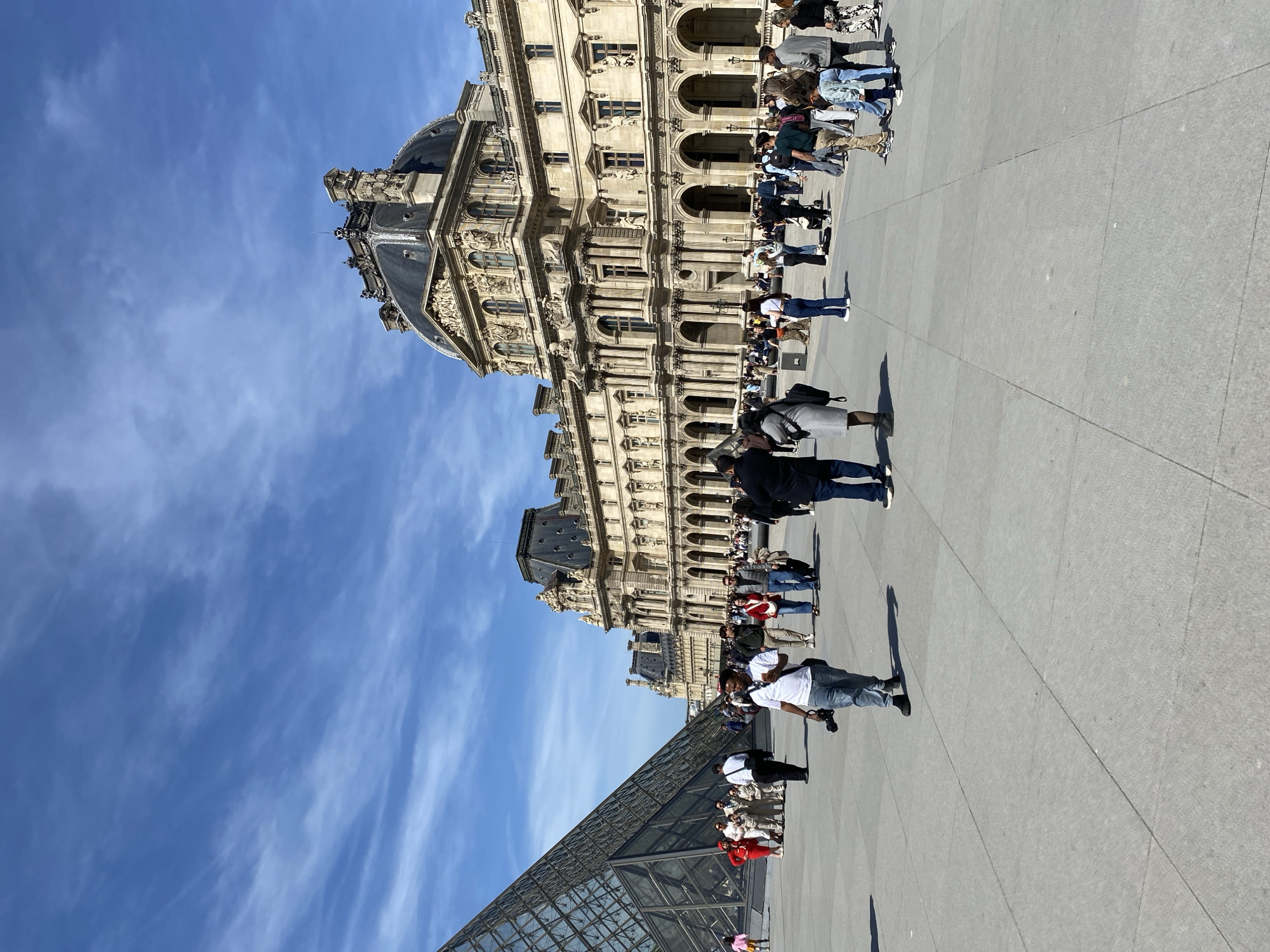 Louvre Museum in Paris, France, taken during daytime with a blue sky and light clouds. The Louvre Pyramid is visible in the foreground. A crowd of people are seen milling around the plaza in front of the museum. The architecture of the Louvre is prominent with its ornate details and dome. Some people are standing and walking across the plaza. The ground appears to be paved with large, light gray stones.