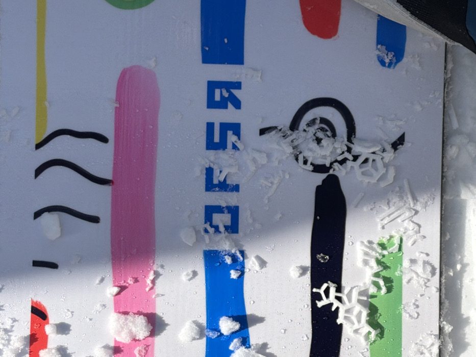 A close-up image shows a snowboard covered in snow. The board features vertical stripes of various colors: yellow, pink, blue, black, and green. It also has black wavy lines and a target symbol. The word "OFFS" is printed in blue, oriented vertically. Scattered across the surface are irregular clumps and individual pieces of snow. Two prominent white snowflake decorations are positioned on the right side of the image.