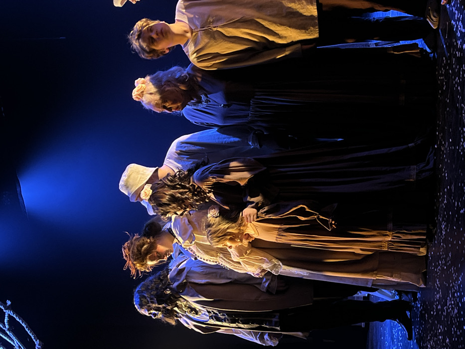 This image depicts a theatrical stage scene in Novoshakhtinsk, Russia, featuring a group of eight individuals in period-style costumes. The scene is dimly lit with a prominent blue spotlight originating from an overhead source in the upper center, casting shadows and highlights. The stage floor is dark and covered with numerous small, light-colored fragments, consistent with confetti or glitter. From left to right, the individuals are arranged in a line, mostly facing forward or slightly right. 1. A male figure with long, dark, wavy hair, dark facial features, wearing a dark ruffled shirt and a light-colored coat, stands in profile, looking downwards. 2. A young adult female with reddish-brown hair styled upwards, dressed in a long, light-colored, ruffled gown with a beaded necklace, stands with her head bowed. 3. A young child, possibly female, in a plain brown long-sleeved dress, stands slightly in front of the second female. Her head is turned to the left, and a hand is visible on her left shoulder. 4. A young adult female with long, dark, curly hair adorned with a light rose-shaped accessory, wearing a dark long-sleeved dress, has her arm around the child. 5. An adult male in a light-colored bucket hat and a simple light-colored tunic stands partially obscured behind the fourth female. 6. An elderly female with light hair styled with two light rose-shaped accessories, wearing a dark dress and a necklace, looks slightly to the right with a neutral expression. 7. A young male or teenager with light brown hair, wearing a simple light brown tunic, stands with his head tilted slightly upwards, looking to the right. 8. A partially visible figure on the far right, showing only a light-colored garment. The background is black, emphasizing the performers. A dark, twisted rope-like object is visible in the upper left corner.