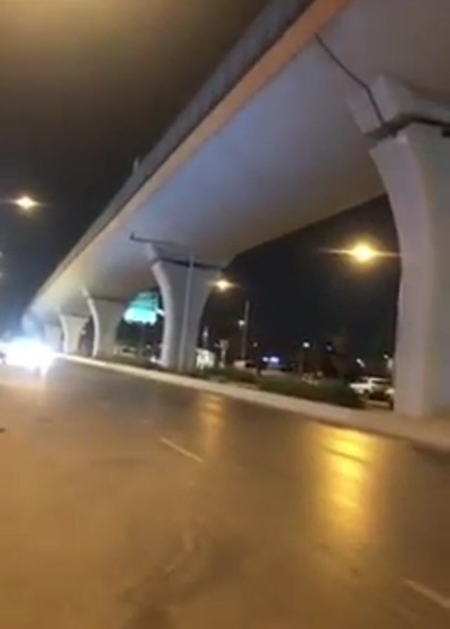 The video is shot at night, from what appears to be ground level on a paved surface, possibly a road or sidewalk