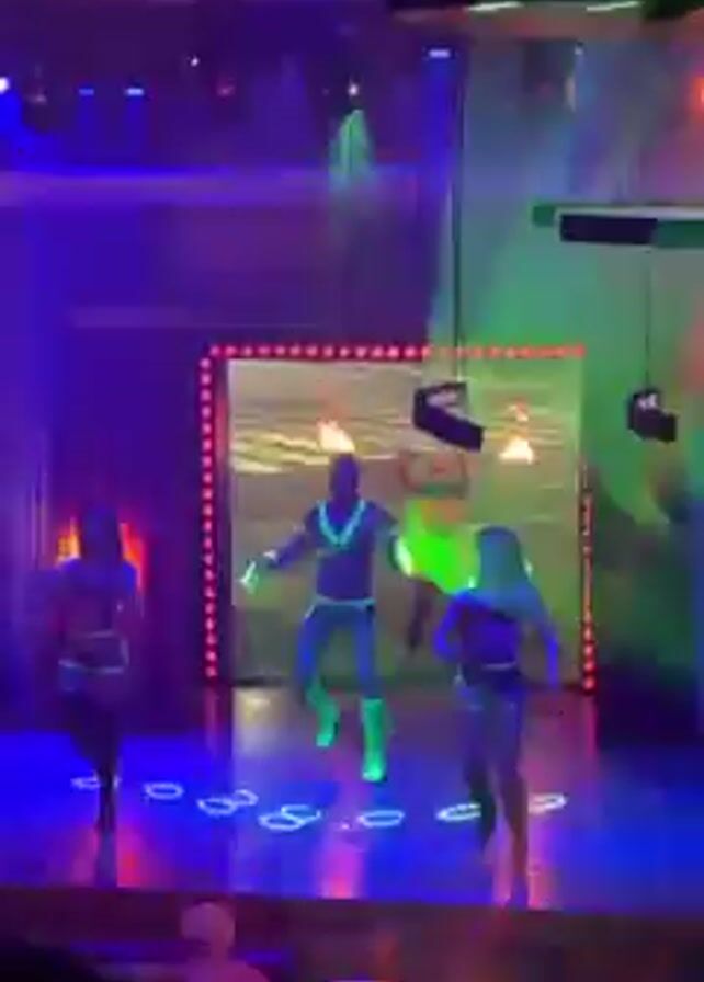 dance performance on a stage with neon lights and a large screen in the background. Four dancers are wearing outfits with neon accents. The stage lighting is dynamic, featuring blue, green, yellow, and orange hues. A crowd can be seen in the foreground.