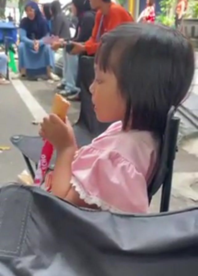 A young girl with short black hair and a pink dress with lace trim is sitting in a black folding chair, eating an ice cream cone. She is positioned in the foreground, angled slightly to the right. Behind her, in the background, are several people, including some women wearing hijabs, and a man in an orange shirt. They appear to be standing or sitting near a street with buildings on either side. The environment suggests an outdoor, possibly urban, setting with trees lining the street. The primary action is the girl eating her ice cream, while the other people seem to be engaged in conversations or observing.