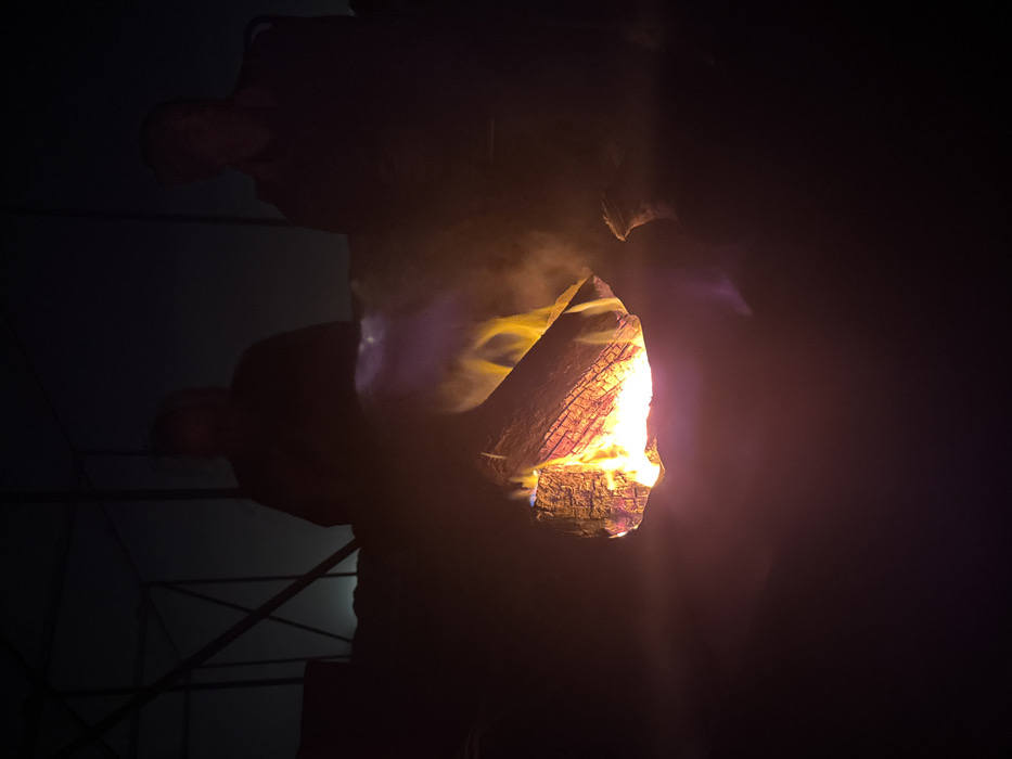 The image captures a roaring fire at night, emanating from within a structure that appears to be some sort of outdoor heating appliance or kiln. The flames are brightly illuminated, contrasting sharply with the surrounding darkness. Smoke rises above the fire, adding to the atmosphere. The overall composition is somewhat abstract due to the low lighting and unclear shapes in the background, but the central focus is undoubtedly the warmth and glow of the fire.