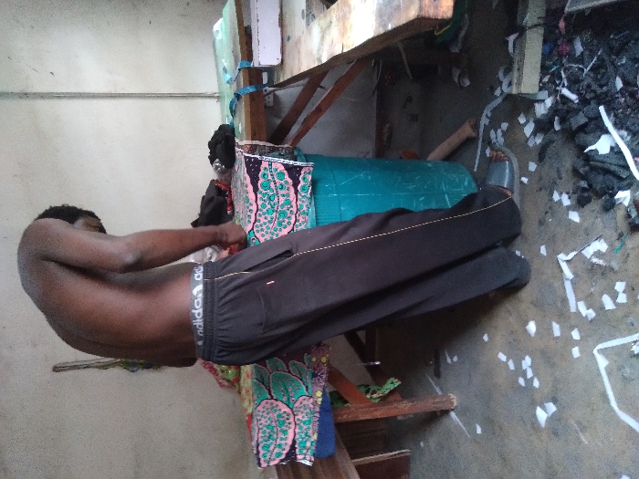 The image depicts an indoor scene in Lafia, Nigeria. A shirtless male individual, with dark skin and short dark hair, stands facing away from the viewer, bent forward. He wears black track pants with a thin white stripe down the outer seam and grey slide sandals. A grey waistband with "adidas" lettering in white is visible above his pants. His hands are positioned near a teal plastic drum situated between him and a wooden table. The wooden table in the foreground is covered with a colorful, patterned fabric displaying blue, pink, green, and white motifs. Dark fabric or clothing items are present on this table. To the right, another wooden table is partially visible, holding a blue strap and a transparent object. The concrete floor is scattered with numerous small, irregularly shaped white scraps, possibly paper or plastic. Near the individual's right foot, a pile of dark, charred debris is present, mixed with some white scraps and green string. The walls are plain and lightly colored, appearing unpainted or weathered.