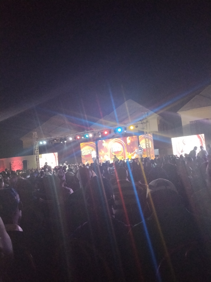 This image depicts a large outdoor gathering at night in Fagge D2, Nigeria. A prominent stage is set up centrally, illuminated by numerous colored stage lights (red, blue, green, yellow). Three large LED screens are visible on the stage, with the central screen displaying graphic content, possibly text reading "SURVIVAL DRAMA" and an ornate arch design. A dense crowd of people occupies the foreground and mid-ground, facing towards the stage. Their backs and heads are largely visible, indicating an audience engaged with the event. Behind the stage, the rooflines and upper sections of two light-colored buildings are discernible. Bright light sources from the stage create significant lens flares across the image.
