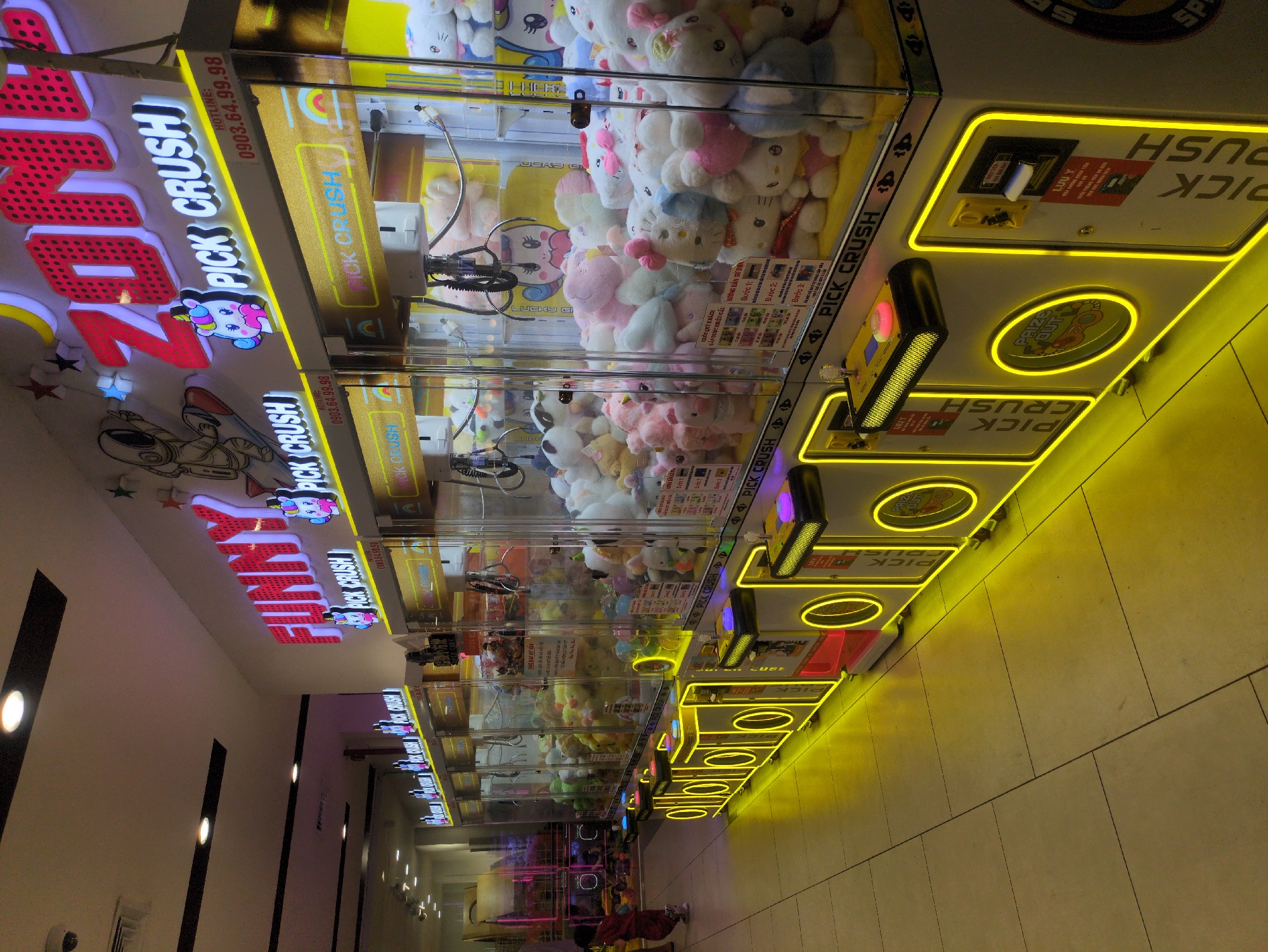 row of claw crane arcade games, likely located in an entertainment establishment or shopping mall. The games are brightly lit with yellow neon accents and filled with stuffed plush toys. The signs on the games read "Pick Crush" and feature cartoon characters. The arcade appears to be in Quy Nhon Ward, Vietnam based on the local text and hotline number displayed on the games. A person is visible in the lower part of the image.