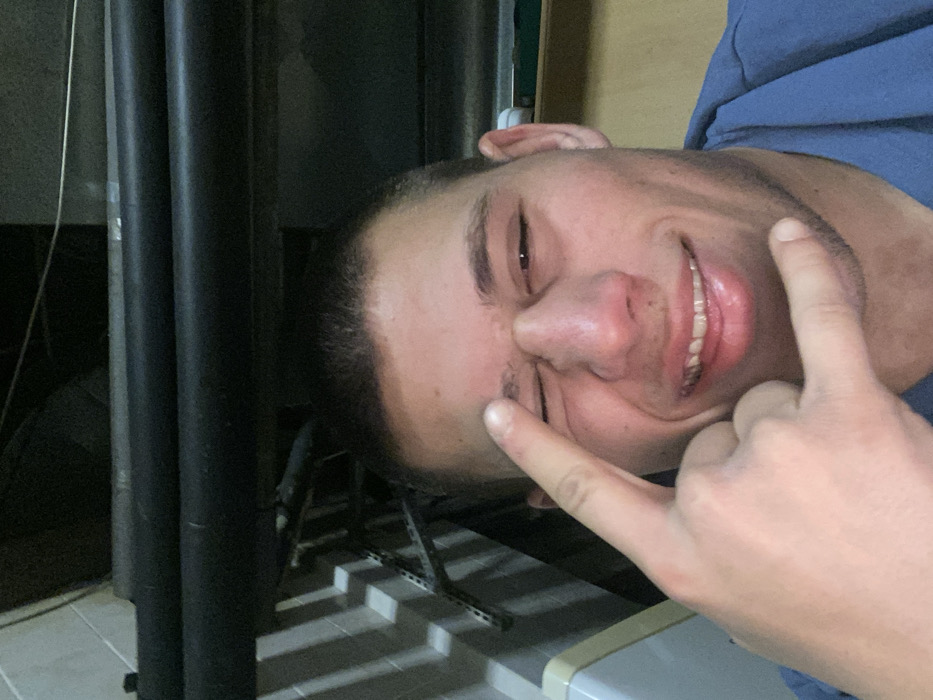 The image depicts a close-up, chest-up shot of a single male subject captured indoors. The subject, a male with short, dark hair (buzz cut), is smiling broadly with his eyes squinted or closed, exposing his upper and lower teeth and a portion of his tongue. He is wearing a blue garment, possibly a t-shirt or scrub top. His right hand is raised, performing a "rock-on" or "horns" gesture, with the index finger extended and touching his forehead between the eyebrows, while the thumb and pinky finger are also extended. The background suggests an unfinished utility space or basement. Two dark, insulated pipes run horizontally across the upper portion of the frame behind the subject's head. To the left, a light-colored, possibly white or off-white, appliance or cabinet is partially visible, alongside what appears to be a metal shelving unit or structural support with multiple horizontal and vertical components. The wall surface to the left of the subject and behind the shelving appears to be constructed from light-colored blocks or tiles. The lighting is dim and artificial. The specific location within the city of Plovdiv, Bulgaria, cannot be identified from the visual information presented; however, the scene is an indoor utility area or basement environment.
