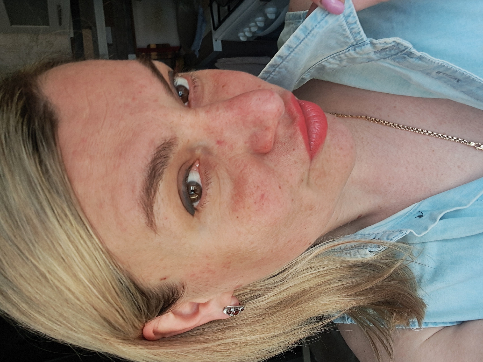A headshot-style portrait displays an adult female in an indoor kitchen setting located in Yegoryevsk, Russia. The subject has fair skin, blonde hair, and brown eyes, with visible freckles and some minor redness on her face. She wears light eyeliner and coral-colored lipstick, directing a focused gaze towards the viewer with a slight pout. She is attired in a light blue, denim-style sleeveless top featuring a collar. Accessories include a thin gold-colored chain necklace and a silver-colored hoop earring with small red stones in her visible left ear. Her right hand, partially visible with a pink-painted fingernail, is positioned at the collar of her top. The background on the right side of the frame reveals a white gas stove with multiple control knobs, adjacent to dark counter-tops or shelving, and a light-colored cloth hanging.