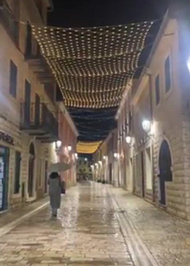 A nighttime street scene shows a woman walking down a cobblestone street holding an umbrella. The street is wet, likely from rain. Buildings line both sides of the street, and strands of lights are suspended overhead. Street lamps provide additional illumination.