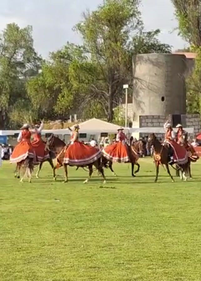 six women riding horses on a large green lawn. They are dressed in similar outfits, including red skirts with white lace details, white hats, and dark riding coats. The horses are dark-colored, and they appear to be performing a choreographed routine. In the background, there is a crowd of people watching the performance, as well as tents and a tall, cylindrical stone structure. The setting appears to be an outdoor event, possibly a cultural festival or equestrian competition. The sky is overcast, and there are trees visible in the background.