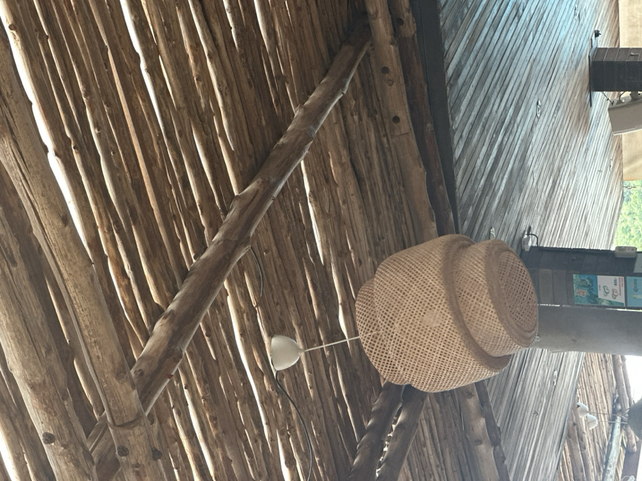 The scene depicts a semi-enclosed structure in Baan Chaweng Noi, Thailand, focusing on the ceiling and upper architectural elements. The overhead structure features a rustic roof or ceiling composed of numerous rough-hewn, natural wooden logs laid parallel to each other, supported by thicker, darker wooden crossbeams. Sunlight filters through the narrow gaps between the logs, creating bright streaks. A prominent, multi-tiered pendant lampshade, constructed from woven light-brown wicker or rattan, hangs centrally from the wooden log ceiling via a white cord and ceiling rose. To its left, another smaller, white dome-shaped light fixture is suspended. Further below and to the right, a lighter-toned, possibly corrugated or planked ceiling/awning runs horizontally. A structural pillar, light in color, is partially visible on the lower left, displaying small, colorful posters, one clearly featuring "Corona" branding with a green leaf logo. A darker, structural column is present on the right. The background shows blurred green foliage, indicating an outdoor or open-air setting beyond the structure. No individuals or active interactions are present.