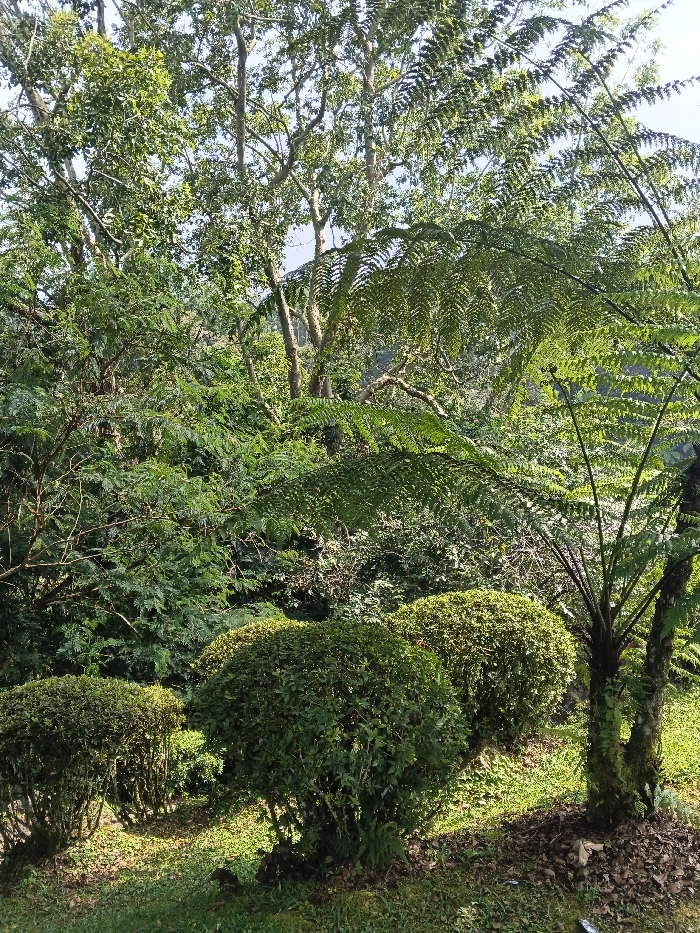 Lush greenery fills the frame, featuring a dense array of trees and bushes. Rounded shrubs line the foreground, leading to a backdrop of mixed tree species. A striking fern tree stands prominently on the right, its fronds adding a feathery texture. Sunlight filters through the canopy, casting dappled shadows on the ground, accentuating the natural, untamed beauty of the landscape.