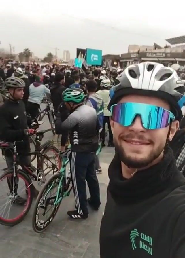 A man is taking a selfie in a crowd of people. The man is wearing a black sweater, a black scarf, a white and gray helmet, and reflective sunglasses. He is smiling. Behind him, there are other people, some of whom are wearing helmets and riding bicycles. There is a building in the background and flags and signs are visible. The weather appears overcast.