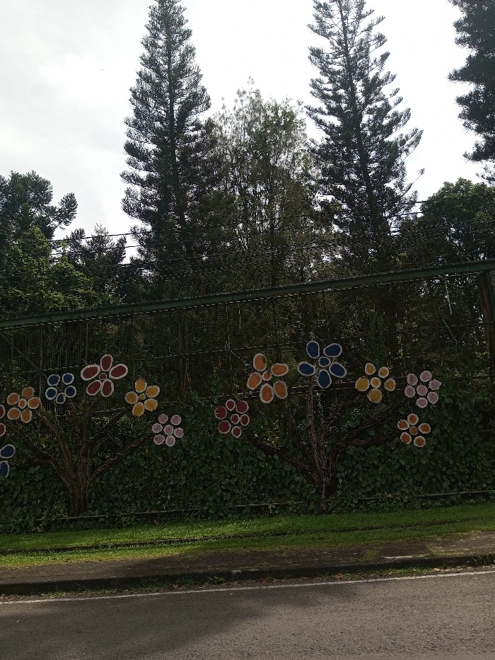 This image depicts an outdoor scene in the city of Namthoung, Laos, on an overcast day. A dark grey asphalt road occupies the bottom foreground, bordered by a strip of green grass and a darker curb. Immediately beyond the grass, a dark metal fence or wall runs horizontally across the midground. This fence is decorated with multiple stylized trees formed from wire, featuring branches and leaves rendered as clusters of colorful, irregularly shaped "flowers." These decorations exhibit various color combinations, including blue, red, yellow, orange, and pink/lavender, each cluster typically comprising 3-8 individual shapes. Dense green foliage and bushes are visible directly behind the decorated fence. In the background, numerous tall, dark green coniferous trees, possibly pines, rise prominently against a light grey, overcast sky. No individuals or specific actions are discernible within the frame.